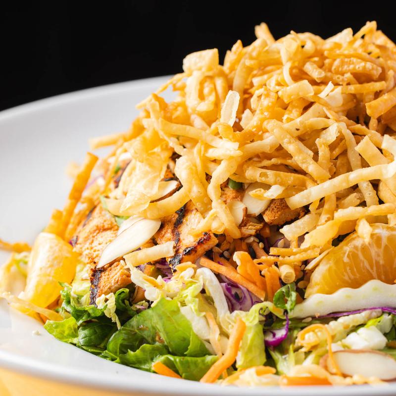 Grilled chicken, romaine, napa cabbage, red cabbage, almonds, carrots, clementines, cilantro, fried wonton, sesame seeds, sesame vinaigrette.